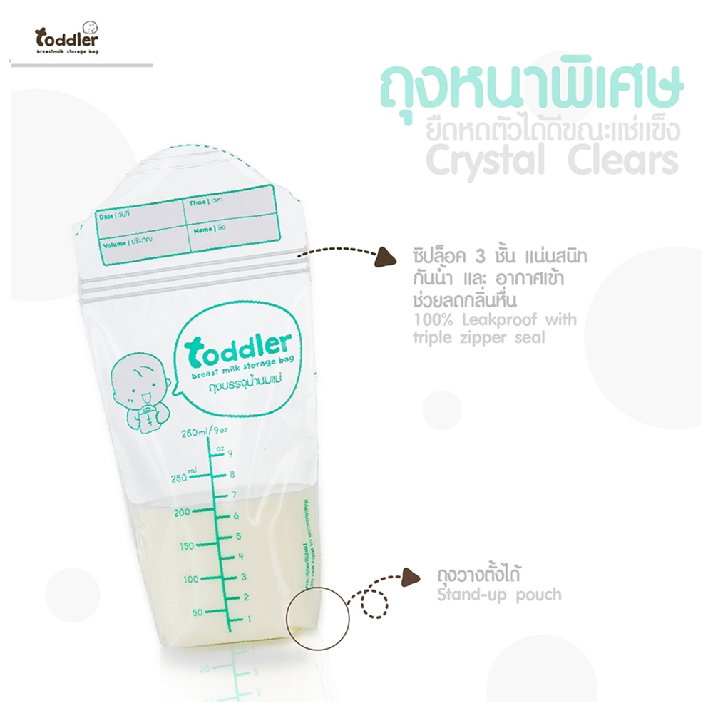 - เนื้อถุงแบบคริสตัล "Premium Crystal polymer" มีความใส ความหนาพิเศษ ทำให้สามารถมองเห็นการเปลี่ยนแปลงของน้ำนมได้ชัดเจน